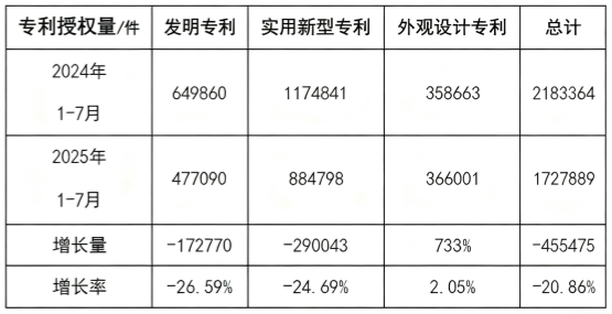 近日,国家知识产权局发布了2025年7月国家知识产权局审查注册登记统计月报。相较于2024年1-7月,2025年1-7月发明专利授权量同比减少26.59%,实用新型同比下降24.69%,外观设计增加2.05%。