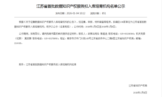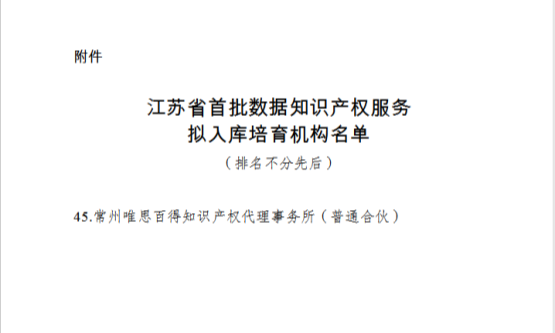 近日,江苏省知识产权局正式公示了首批数据知识产权服务入库培育机构名单。常州唯思百得知识产权代理事务所(普通合伙)凭借在数据知识产权领域的专业服务能力与扎实的工作基础,成功入选该名单,成为全省138家拟入库培育机构之一。此次入选,标志着唯思百得在数据知识产权服务领域的专业能力获得官方认可,也为事务所进一步参与数据知识产权创新实践与服务生态建设提供了重要平台。